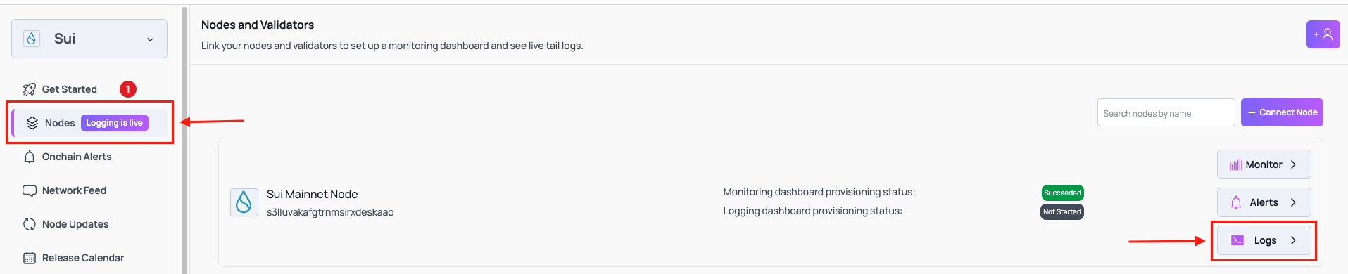 Login to the platform and click on Nodes then click on Logs on the node you wish to setup logging on